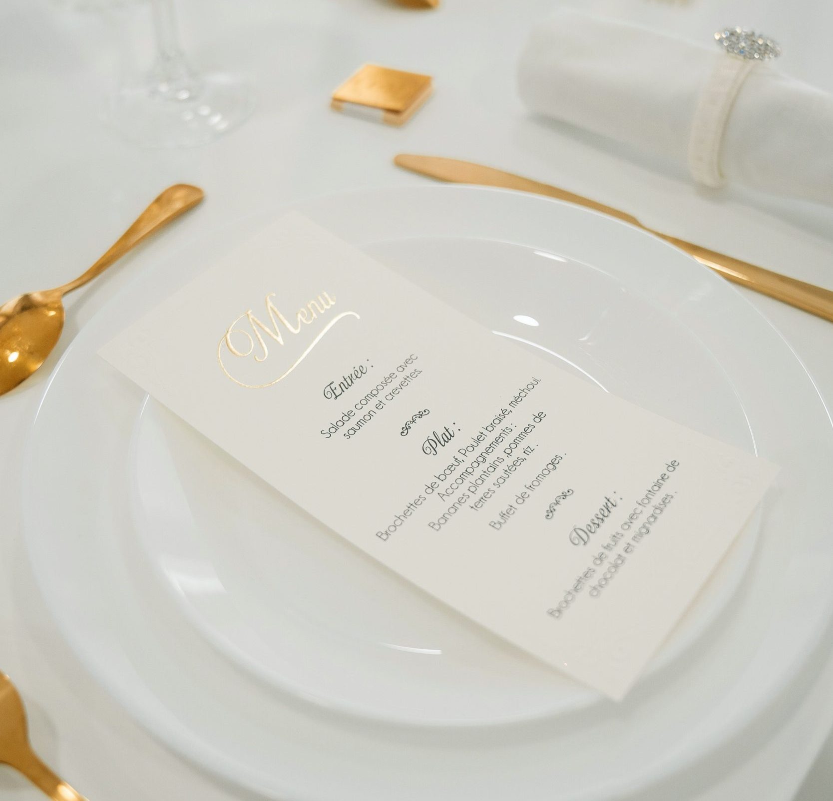 À Posez sur les serviettes de table de vos convives, ces menus blanc et or apporteront de la douceur et de l’élégance à votre décoration de table.