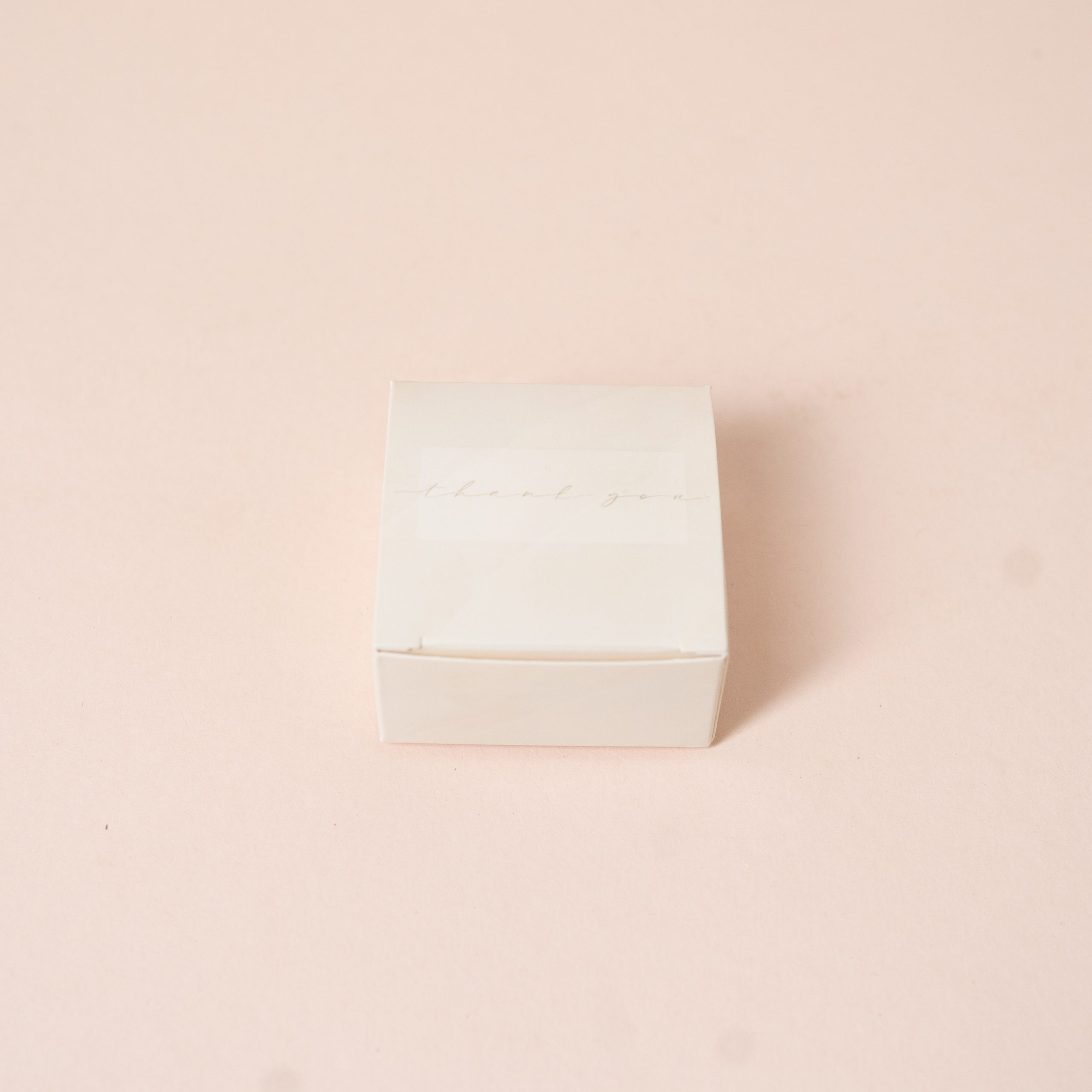Cette boîte saura séduire  vos invités avec son design discret et tendance et  sa délicate inscription “thank you”. À garnir avec vos gourmandises préférées!