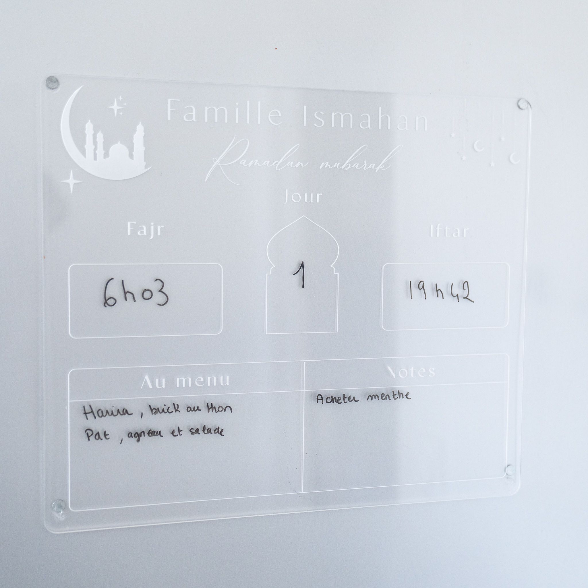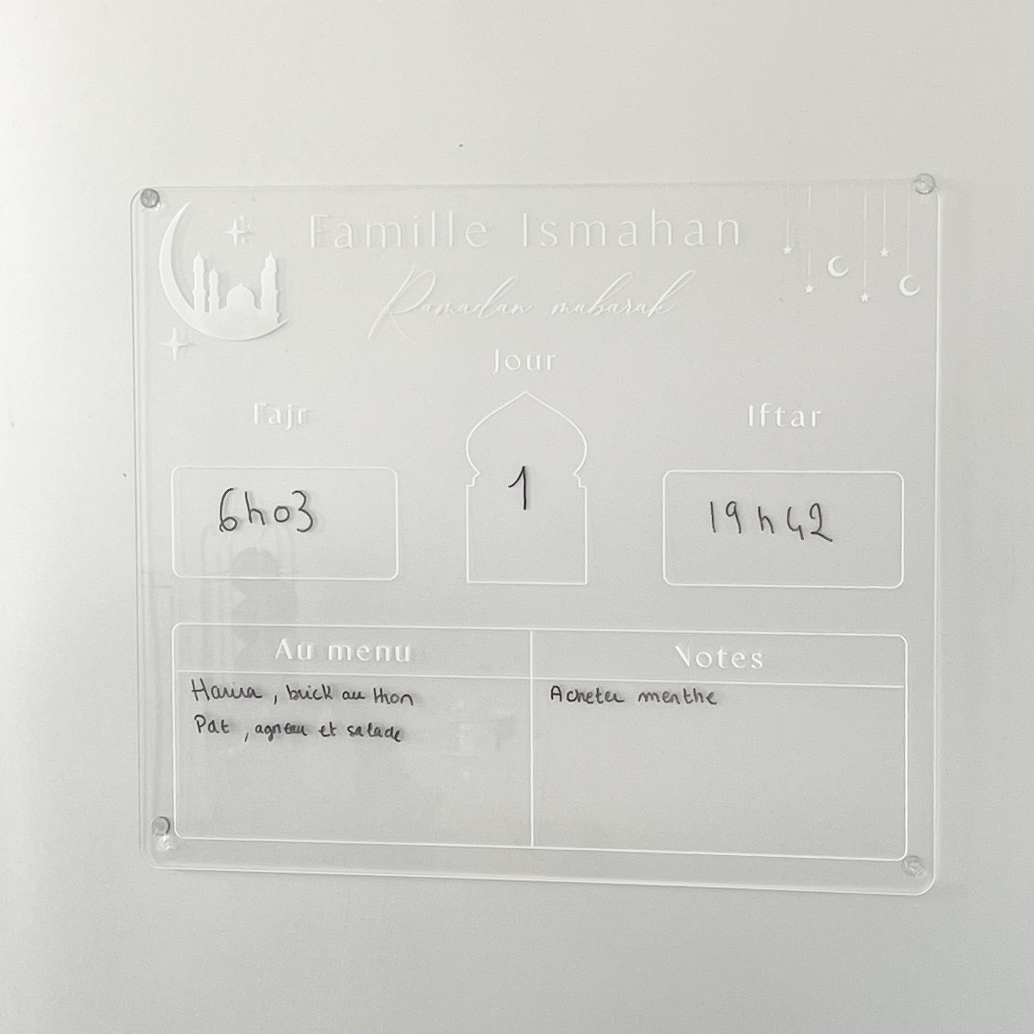 Optez pour notre sublime calendrier ramadan de cuisine en plexiglas brillant. Avec sa gravure blanche fine et délicate il se mariera parfaitement avec la décoration de votre intérieur.