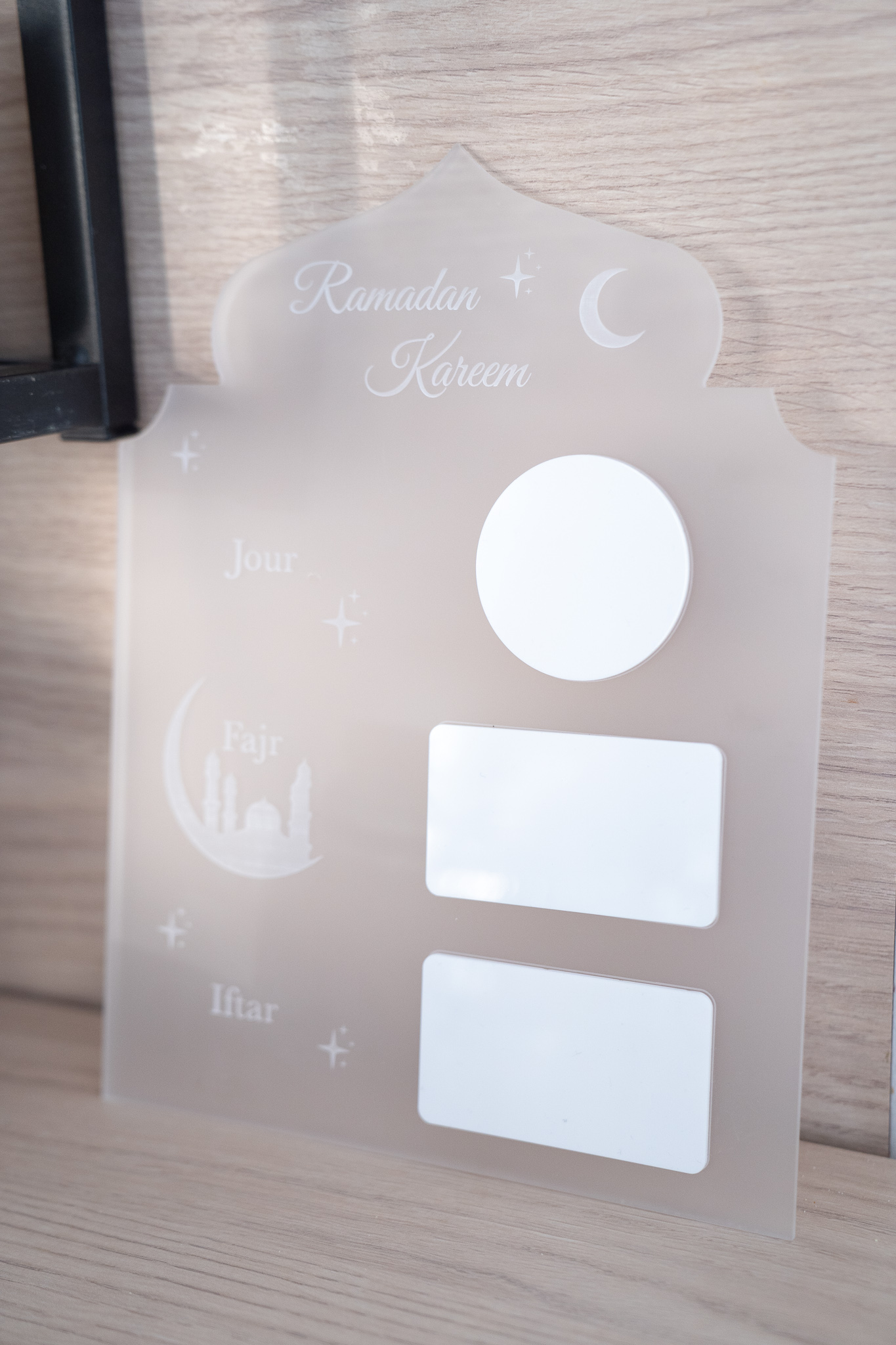 Sublime calendrier en plexiglas givré, vous pouvez y inscrire le jour en cours, l’heure de la prière du matin et l’heure de prière du Maghreb (heure de couper le jeune).