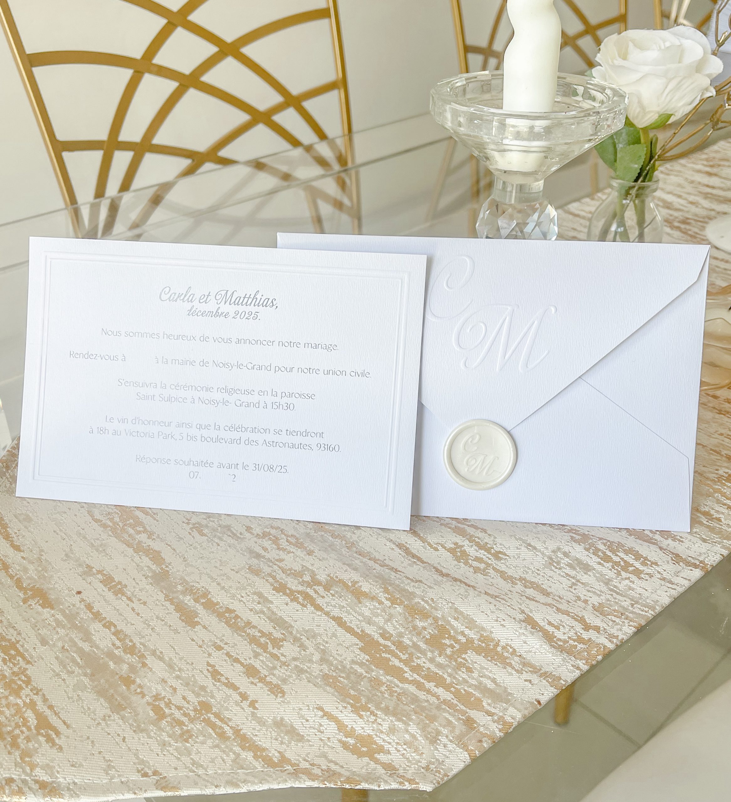 Pour un design sur mesure (couleurs, monogramme sur l’enveloppe, police, mise en page…) n’hésitez pas à nous contacter.