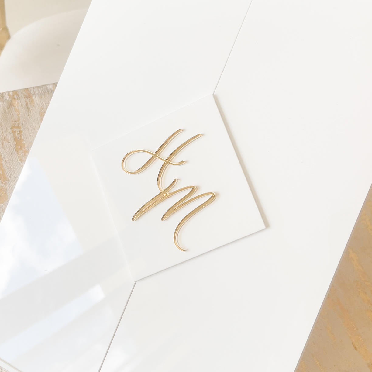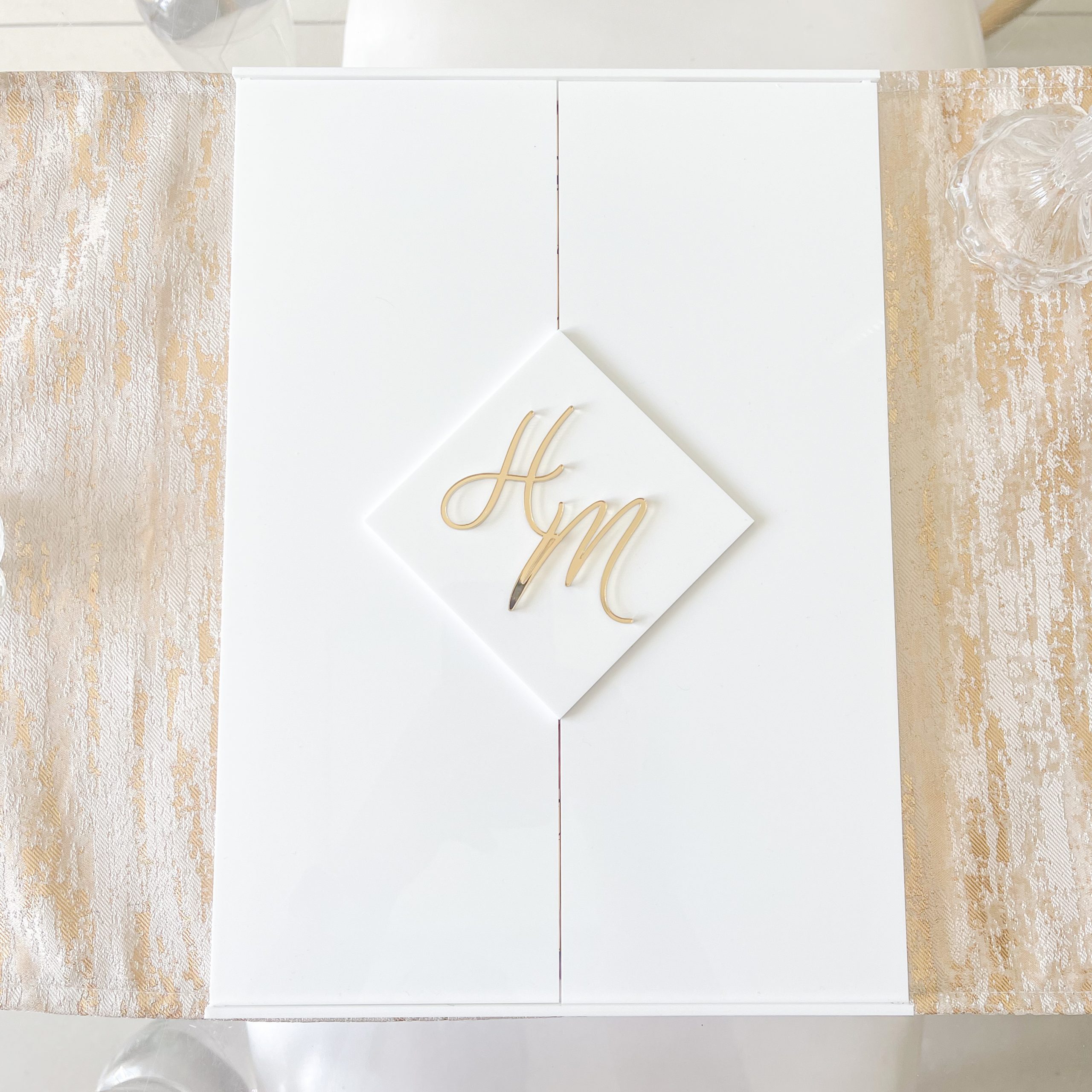 Inclus: plaque en plexiglass miroir et écrin de rangement en plexiglass avec initiales.