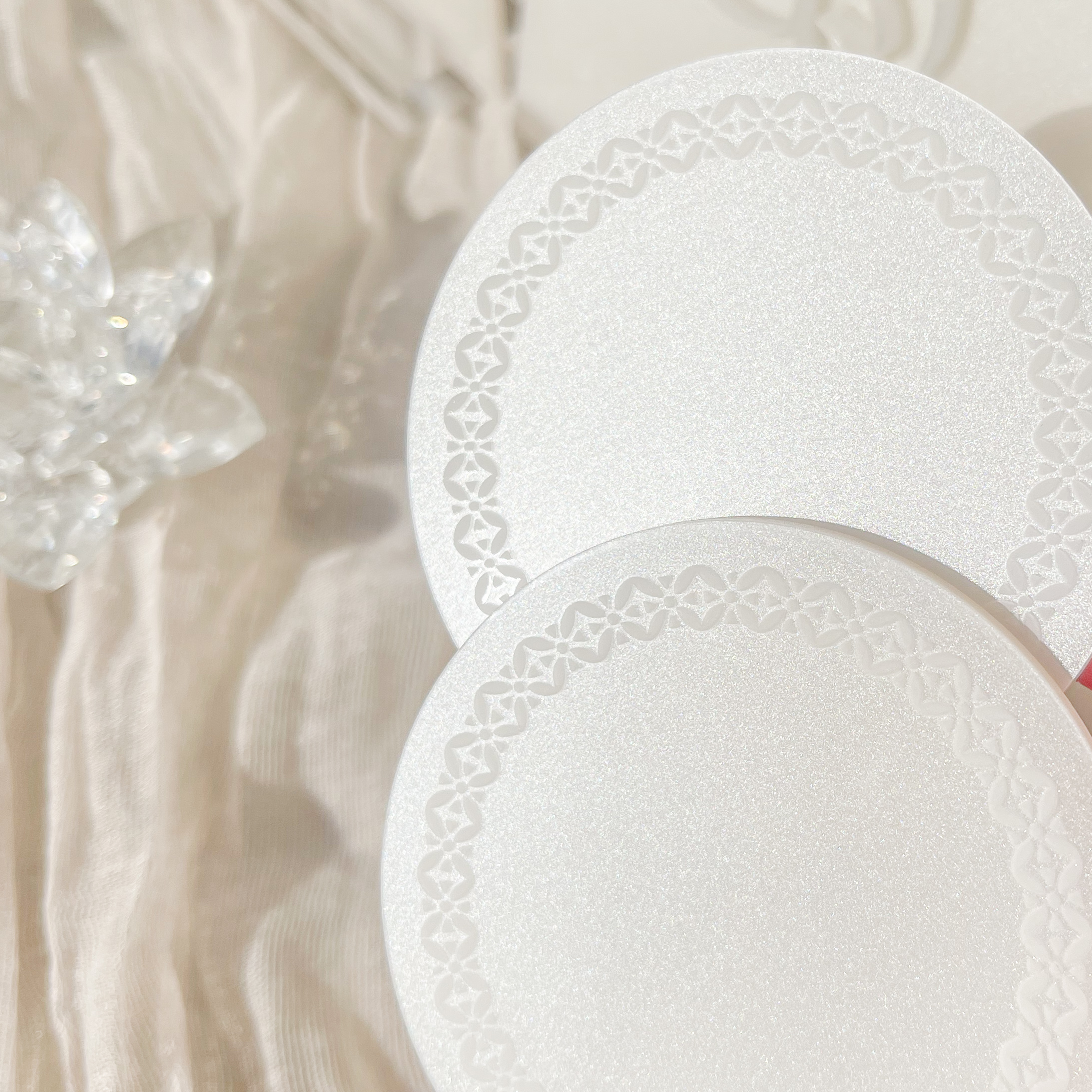Ajoutez une touche d’élégance à vos moments convivial avec ces magnifiques dessous de verre en plexiglas blanc perlé. Leur finition subtilement nacrée reflète la lumière avec délicatesse, apportant une note raffinée à votre table.