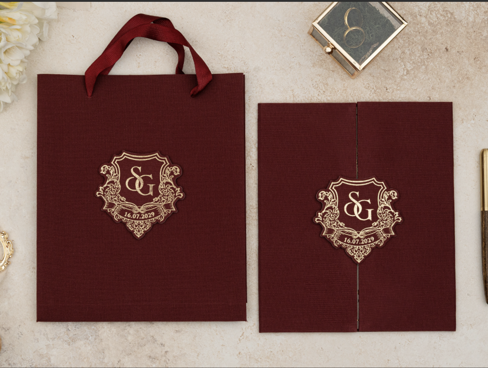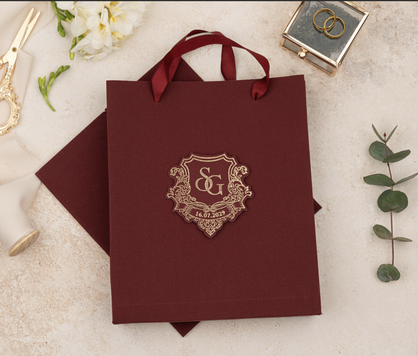Invitation luxueuse cartonnée d’environ 2mm d’épaisseur (19kg pour 100 pièces), sac assorti.