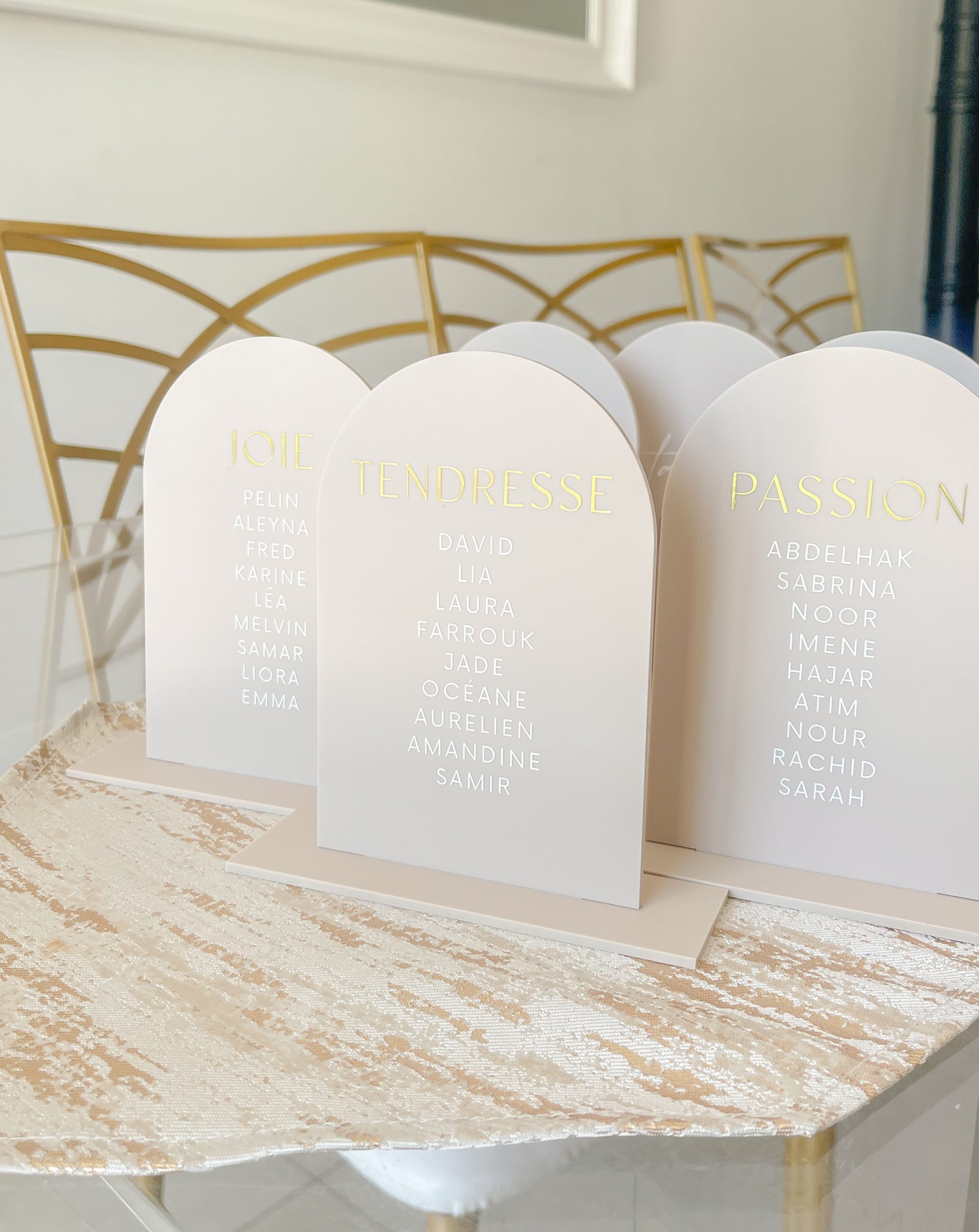 Pancarte Plan de table Arche en plexiglass. Réalisez votre plan de table autrement en optant pour nos pancartes individuelles.
