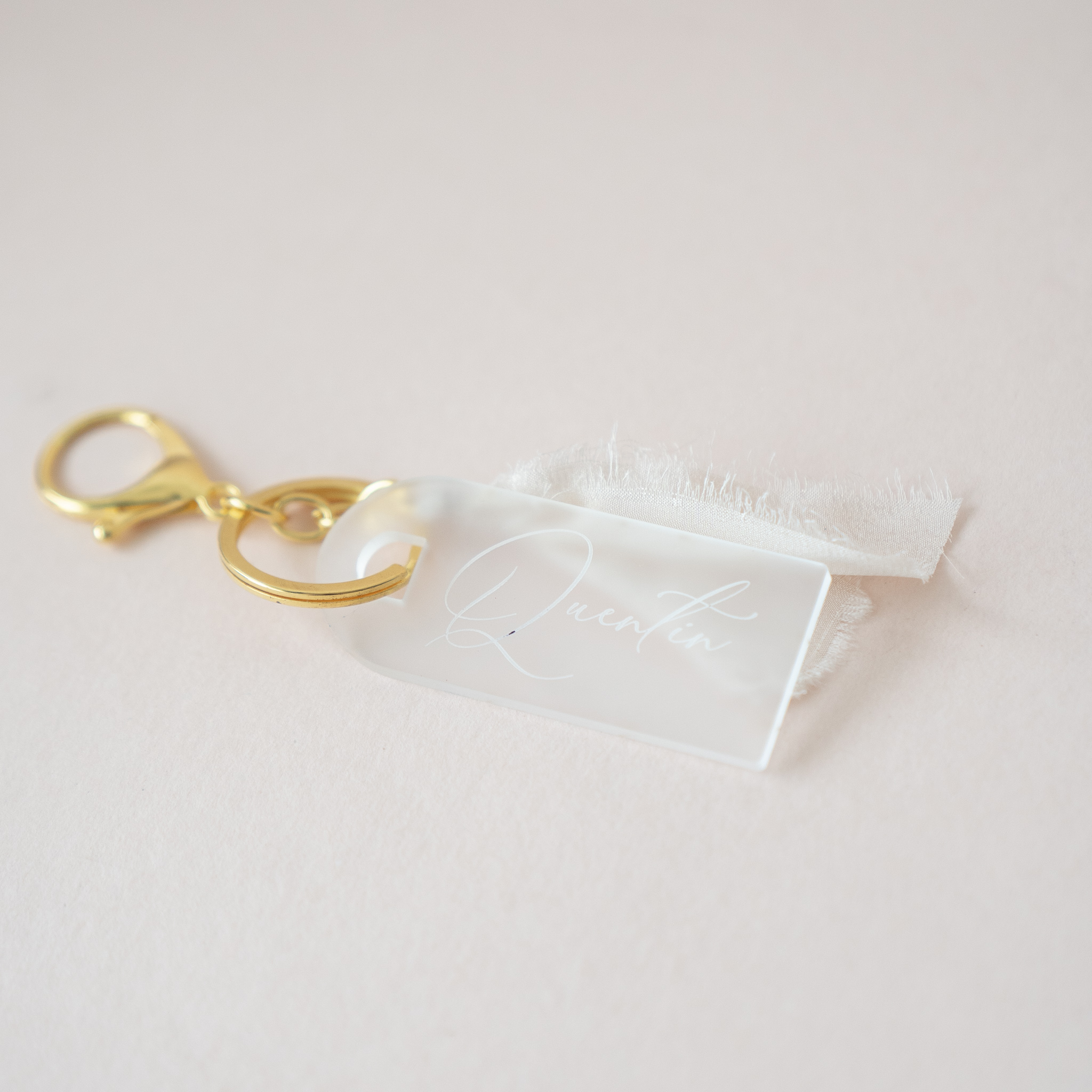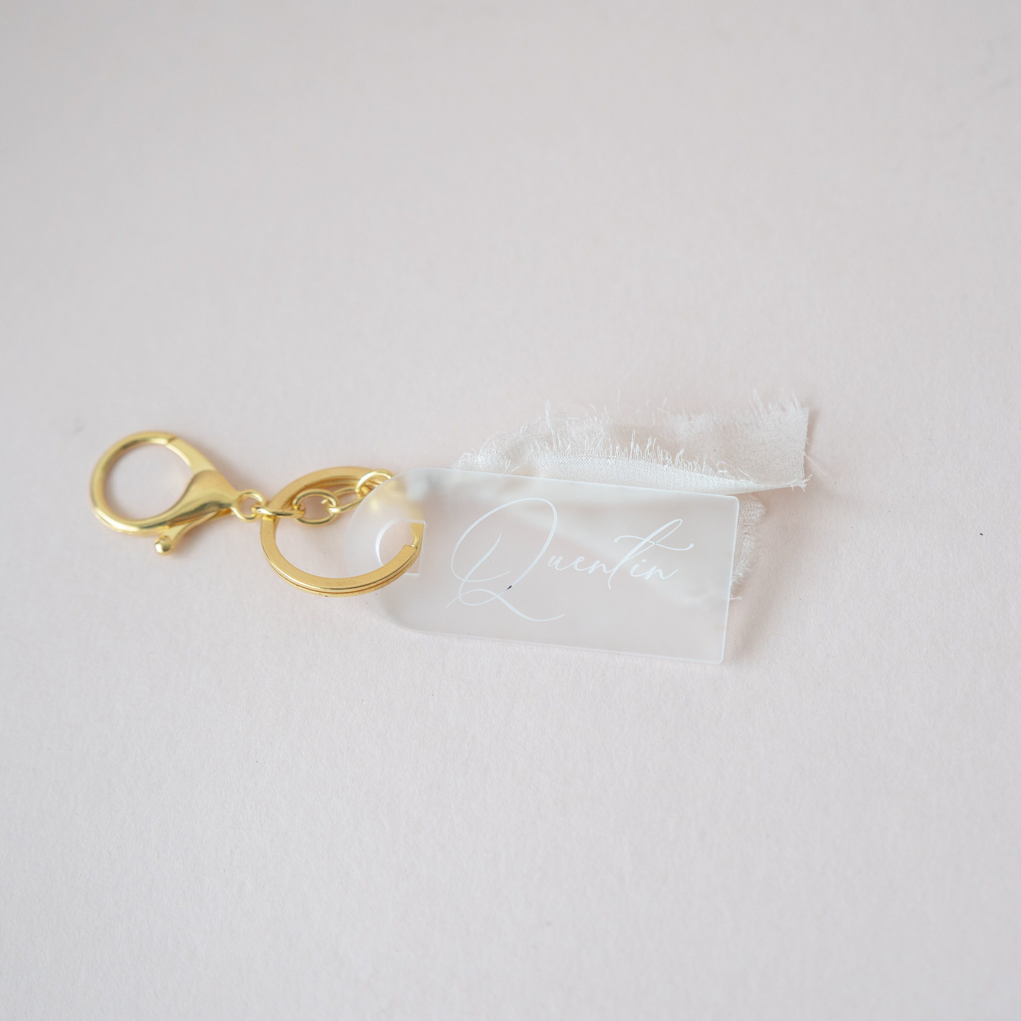 Porte clé personnalisé DÉLICATESSE en plexiglass givré décoré d’un sublime ruban de soie naturelle.