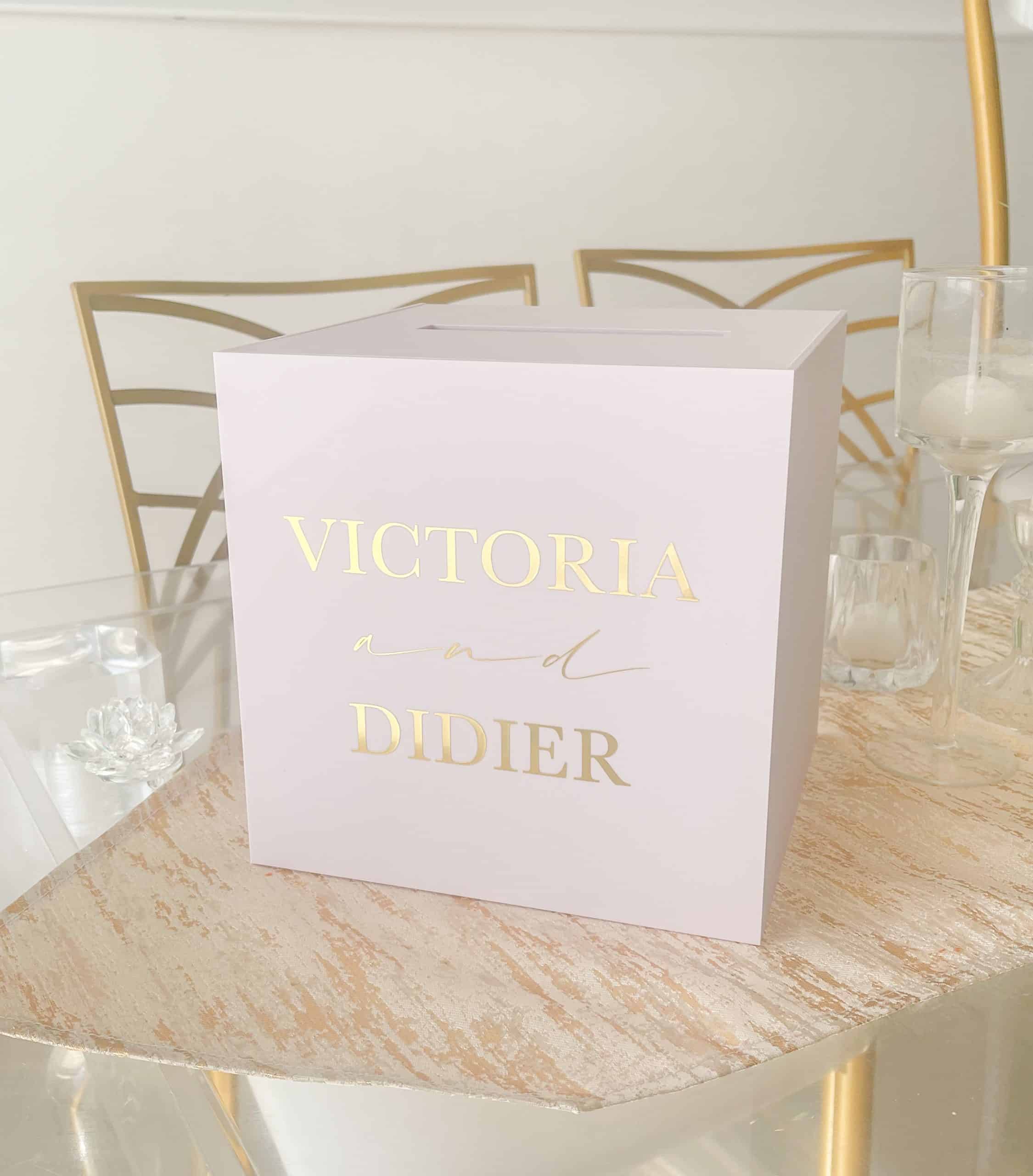 Urne en plexiglass mariage. Le modèle sur la photo est une urne en plexiglas blanc brillant avec écriture or chromé